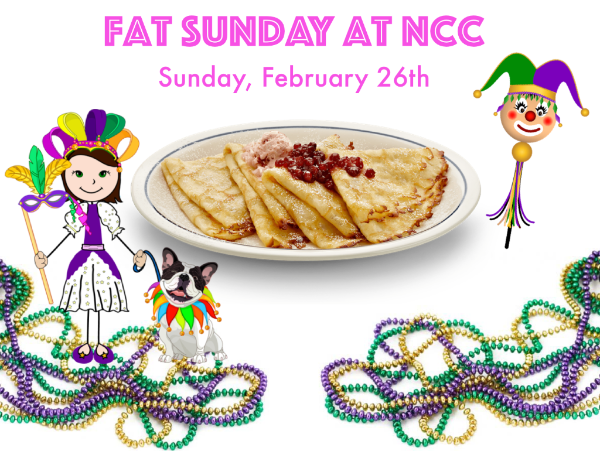Fat Sunday will be celebrated here at NCC on Sunday, February 26 after Service in Bridge Hall! Join us for home made crepes by Mary La Russo as we celebrate Mardi Gras before Lent begins on Wednesday, March 1.
