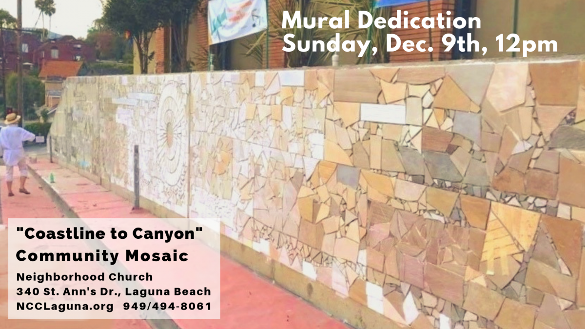 Neighborhood Church in Laguna Beach invites the public to a mural dedication ceremony Sunday December 9, at 12:00pm. The mosaic, titled “Coastline to Canyon”, fronts Glenneyre Street at Saint Ann’s Drive.