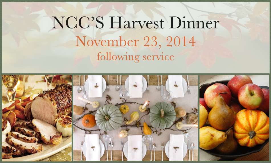 It’s time once again to dust off those treasured holiday recipes for the annual Harvest Dinner! Join us after service in Bridge Hall on Sunday November 23rd for a sumptuous harvest meal brought to you by NCC’s finest cooks! Members of the Fellowship Committee will have sheets available to sign up to bring your family favorites to share.