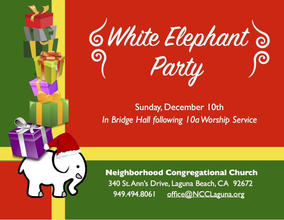 This party is held after church in Bridge Hall. (This year on December 10.) It’s a long standing event that was started when folks would look for “unusual” items at the yearly Bargain Festival. Alas, the festival is no more so we now have to look other places for that special item. In past years strange hats and mechanical toys have been crowd favorites. You do not need to purchase a gift; regifting is fine. Those attending need to wrap and bring a “white elephant” gift and a snack to share with others. Bring a gift, take home a gift—and laugh a lot while enjoying lots of fun with your church family. (Some gifts return yearly.) All are welcome! If you have questions, please call Sharon Garrison, 949-499-2538.