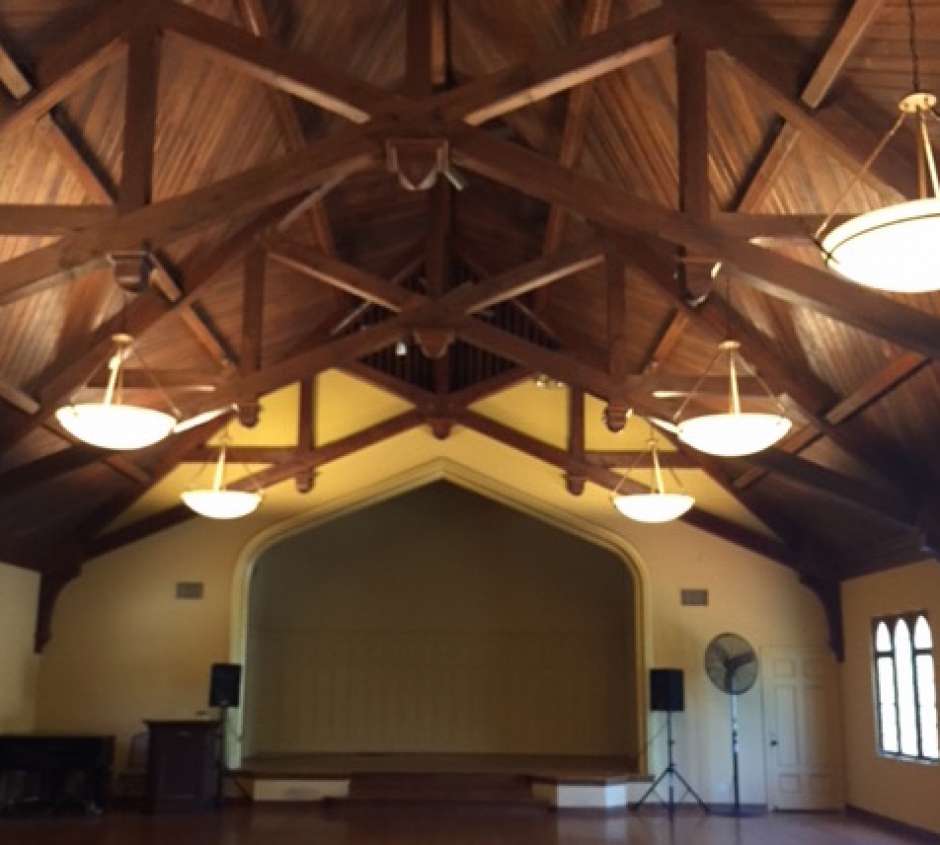Bridge Hall is our large reception hall and meeting space located directly across the courtyard from our Sanctuary. Hardwood floors, stage, stained-glass windows and vaulted ceilings make this a stunning space for large gatherings. A kitchen for food storage and catering preparation is available. Sanctuary weddings receive a 50% discount when holding the wedding reception in Bridge Hall.